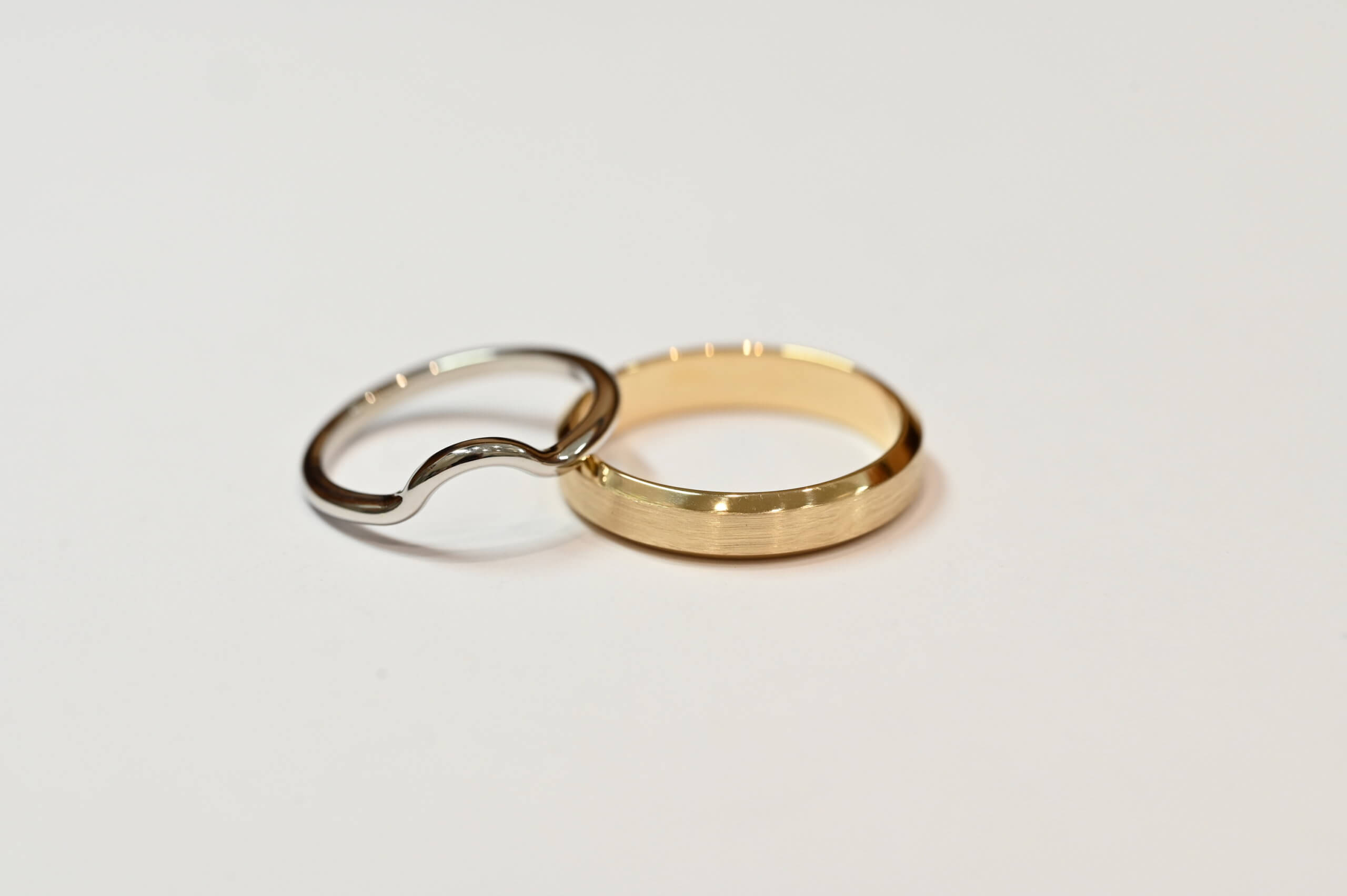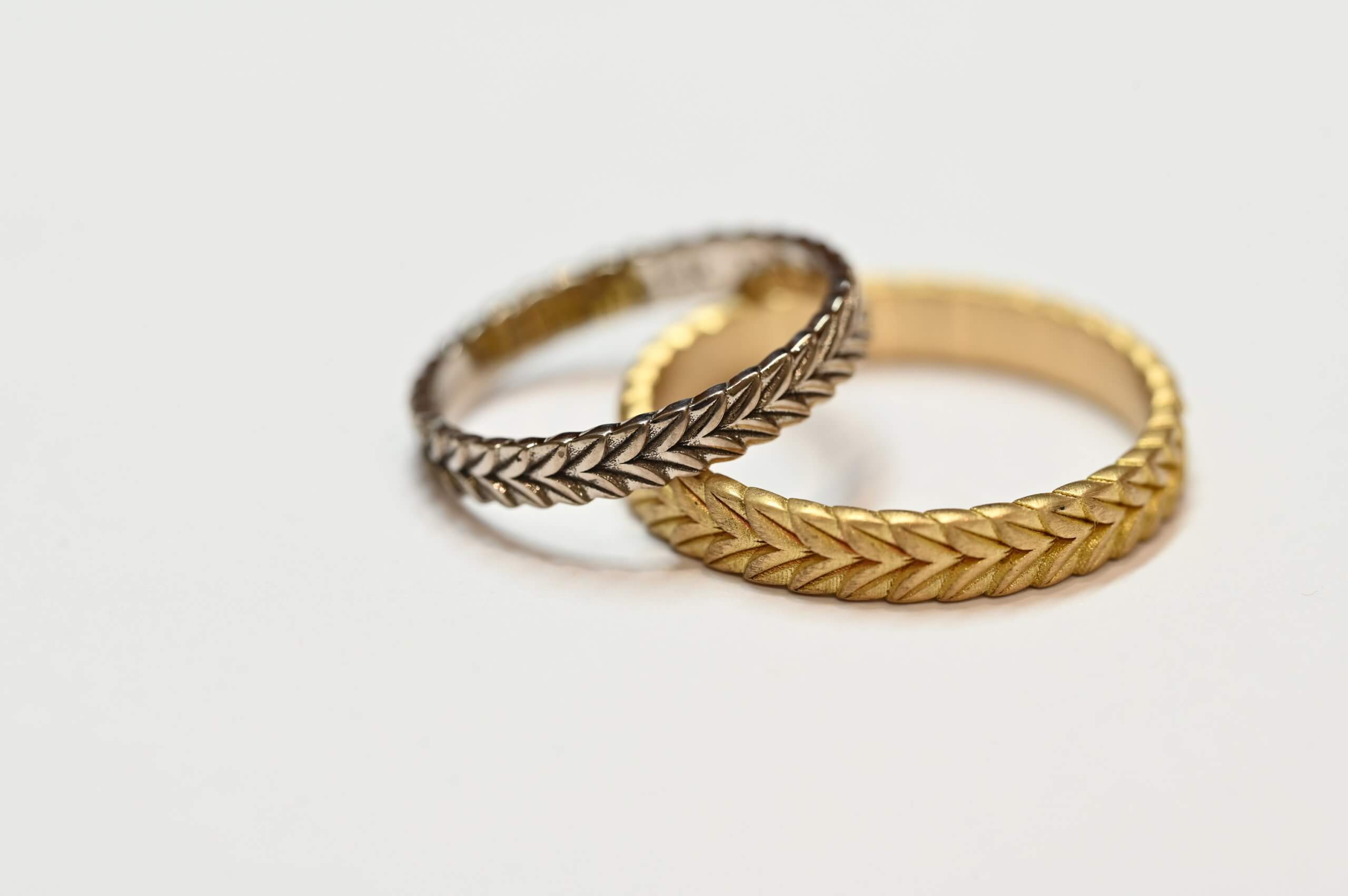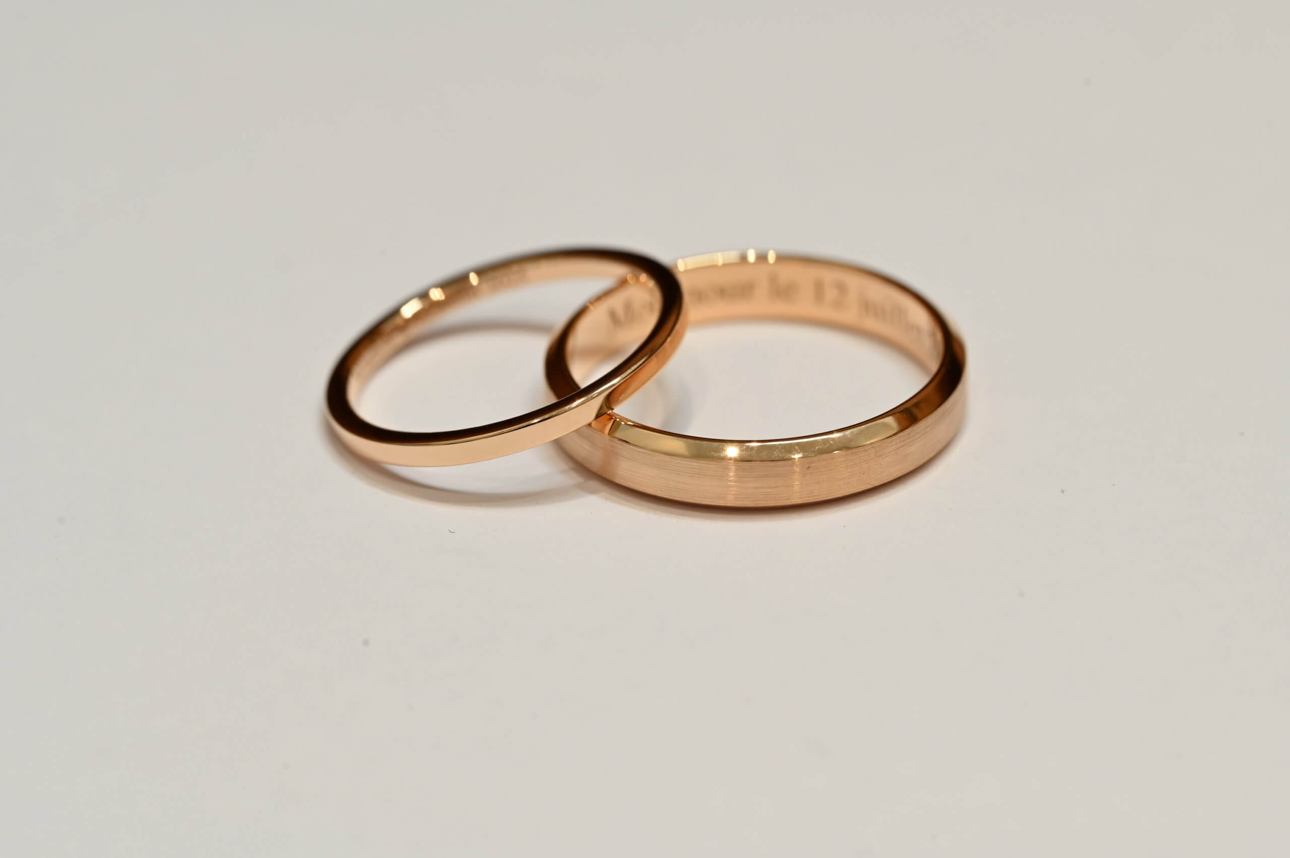 Traditionnellement portée à l’annulaire gauche, l’alliance peut être simple ou ornée de pierres précieuses. La couleur de l’or est un élément fondamental : or jaune pour un rendu chaleureux, or blanc palladié contrasté, or rose pour un effet doux. Vous pouvez également choisir un ouvrage bicolore, voire tricolore ! Jeux de lignes, filets, contrastes subtils viendront alors offrir du caractère à votre bijou. À l’atelier, je travaille uniquement avec de l’or 18K, qui contient 75 % d’or pur.