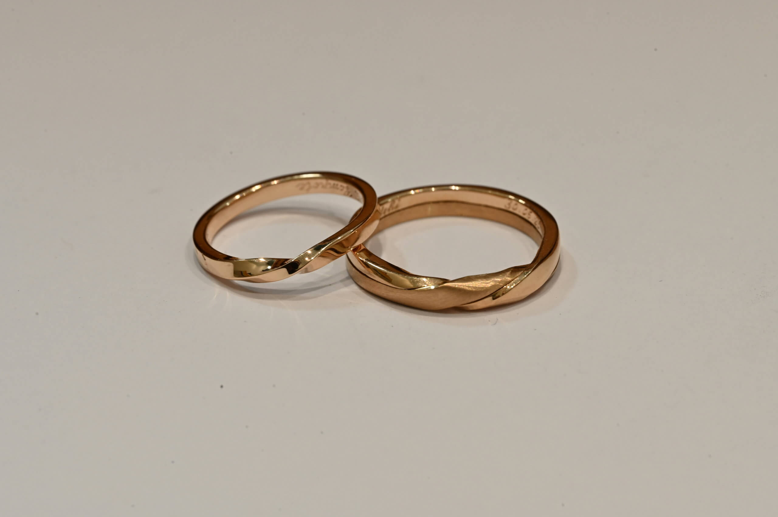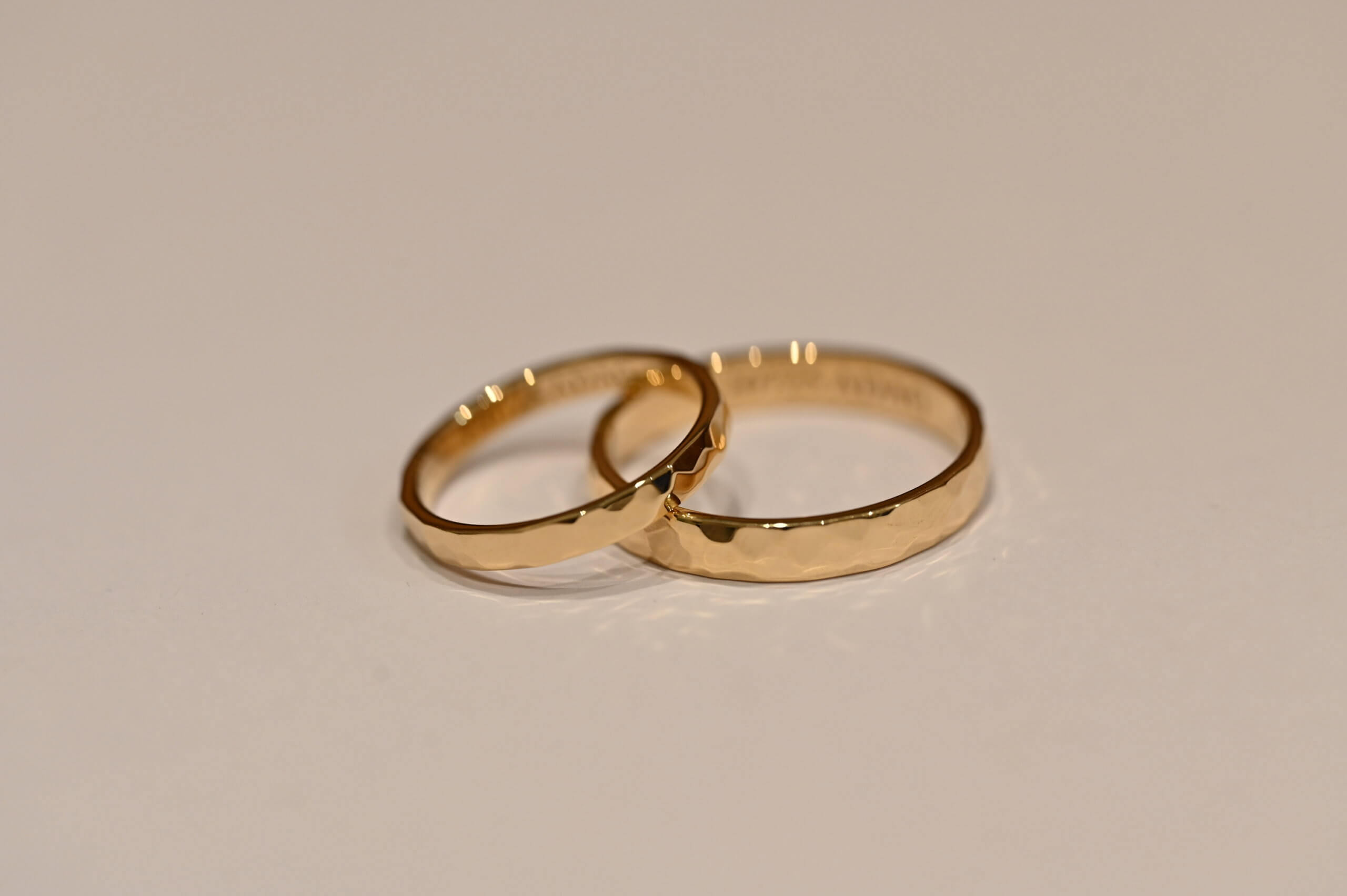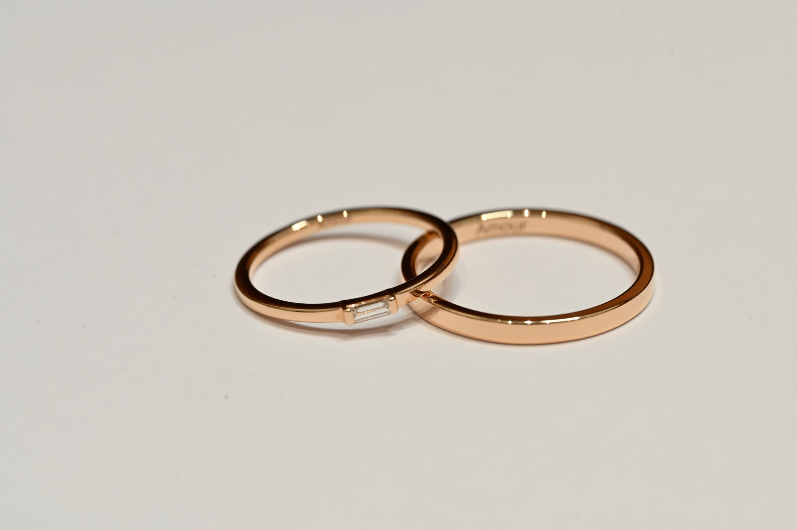 Traditionnellement portée à l’annulaire gauche, l’alliance peut être simple ou ornée de pierres précieuses. La couleur de l’or est un élément fondamental : or jaune pour un rendu chaleureux, or blanc palladié contrasté, or rose pour un effet doux. Vous pouvez également choisir un ouvrage bicolore, voire tricolore ! Jeux de lignes, filets, contrastes subtils viendront alors offrir du caractère à votre bijou. À l’atelier, je travaille uniquement avec de l’or 18K, qui contient 75 % d’or pur.