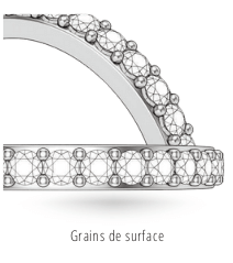 • Serti grains : ce sertissage se présente sous la forme de plusieurs pierres de taille identique séparées par de toutes petites billes métalliques telles un tapis d’étincelles. Il est généralement complété d’une plus grosse gemme centrale dont il fait ressortir tout l’éclat.