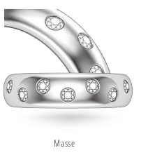 • Serti masse : la pierre est directement intégrée au métal et sa partie supérieure arrive au ras de la surface. Résultat : un bijou minimaliste, idéal pour les alliances mixtes.