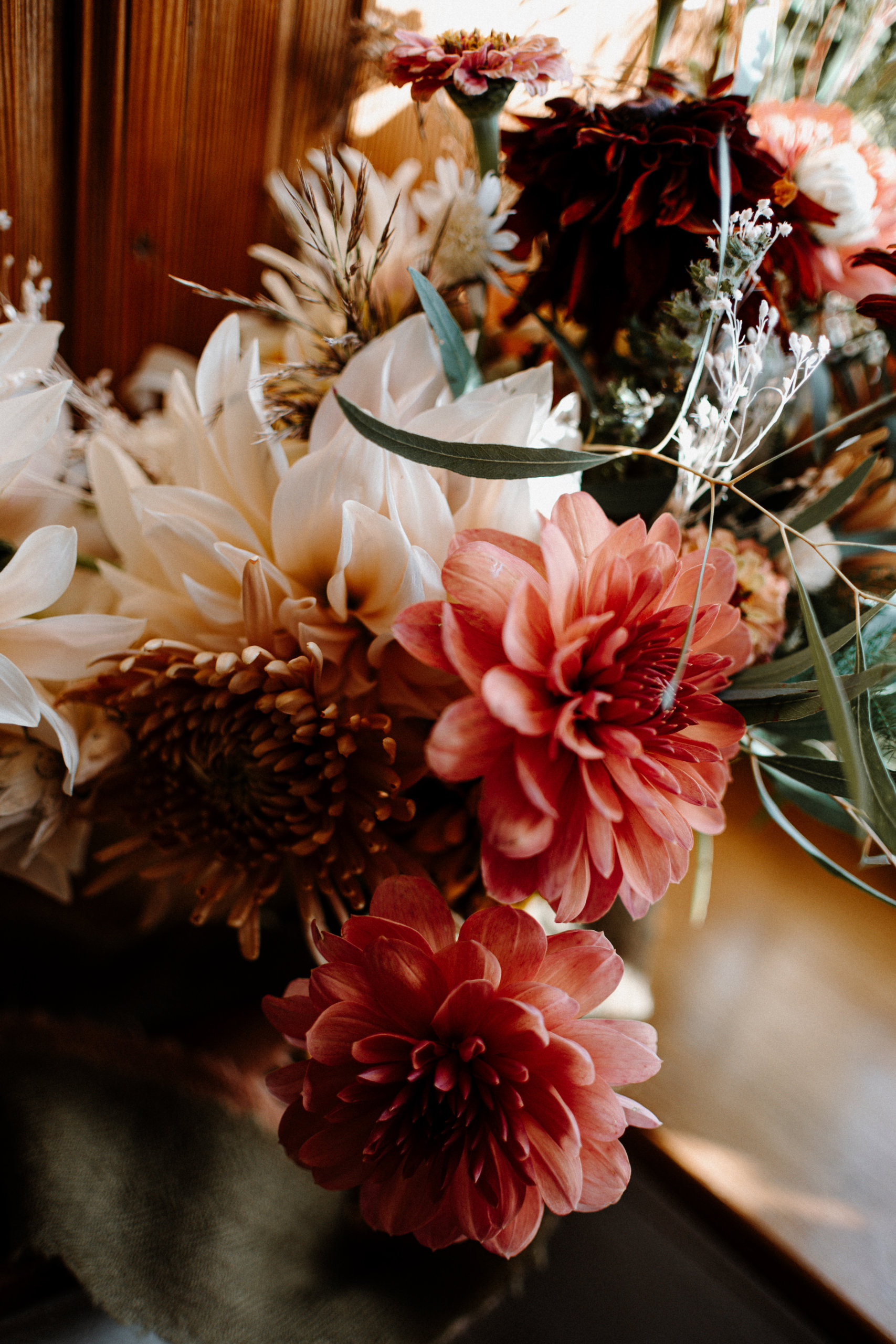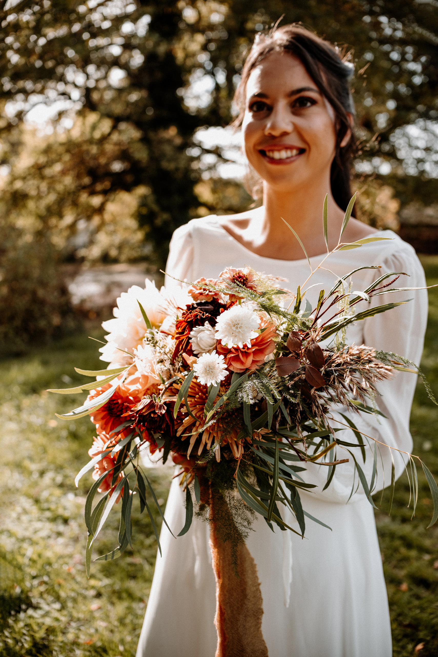 On retrouve dans le bouquet des dahlias crème, de l’hortensia séché, du feuillage d’olivier… Une déco de mariage en clin d’œil à la nature qui s’endort, tout en gardant sa poésie.