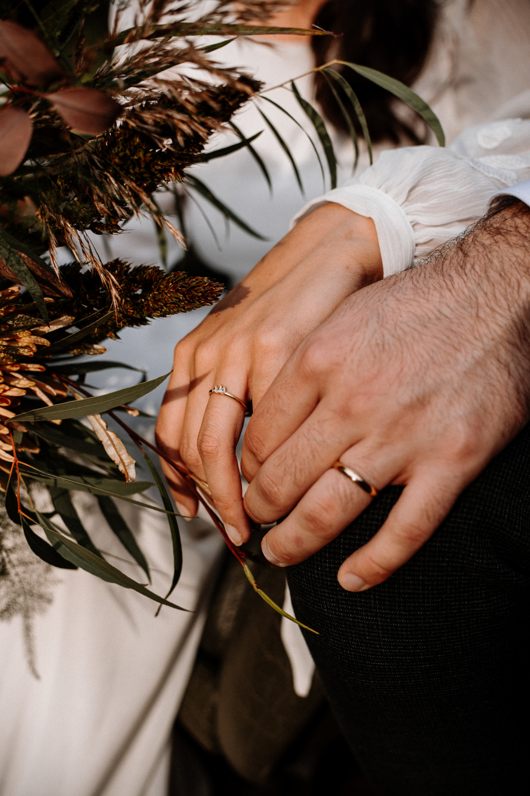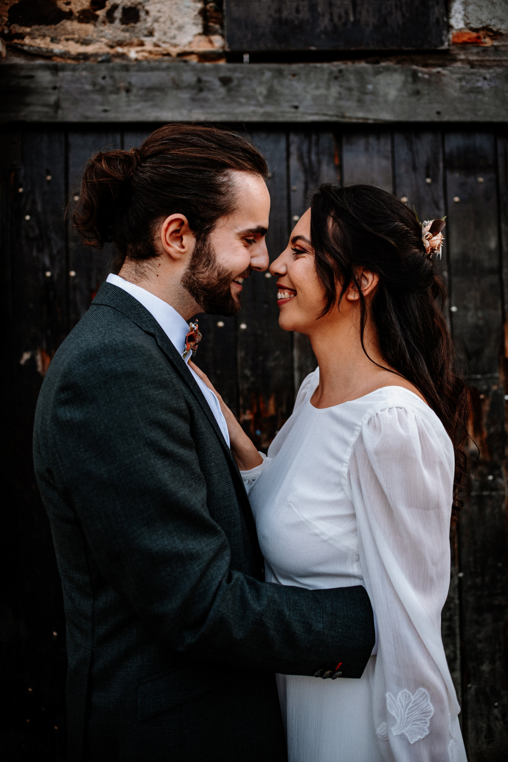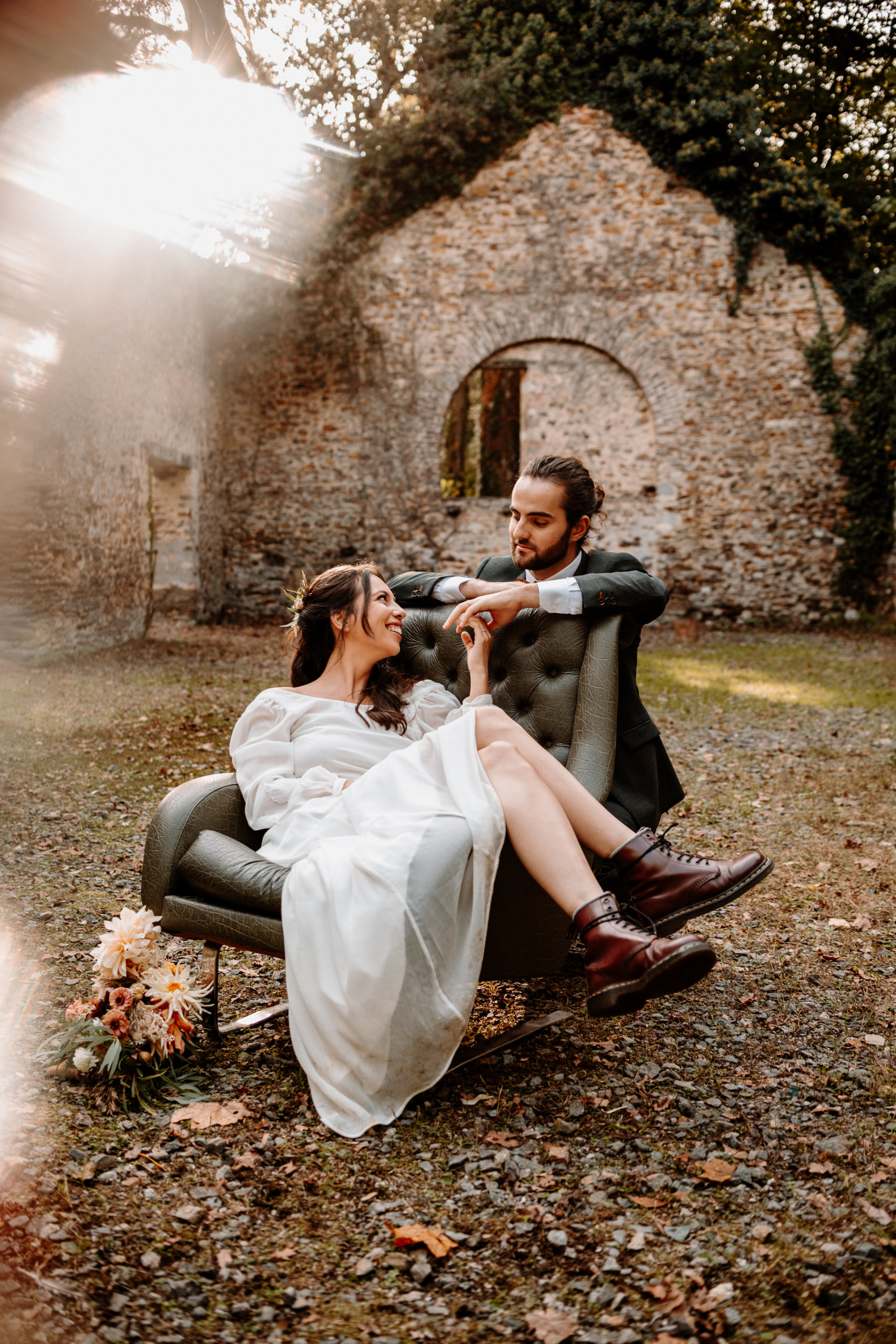 Sur notre shooting, les mariés évoluent dans un décor à la fois bohème et romantique, dans une ambiance presque cinématographique. La mariée, en robe fluide à manches bouffantes, incarne la grâce et la simplicité. Le marié, en costume foncé et boots en cuir, apporte une touche contemporaine à l’ensemble.