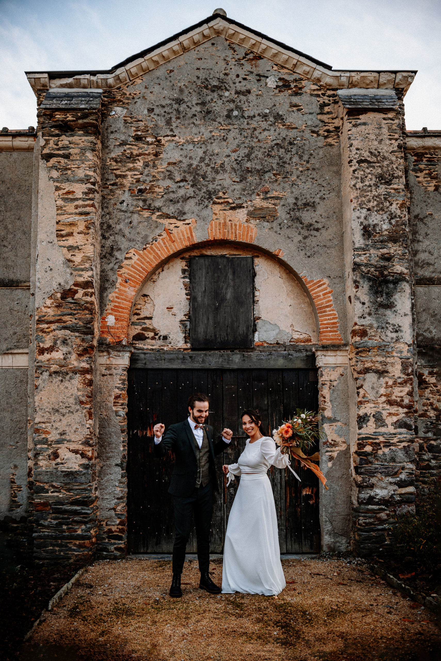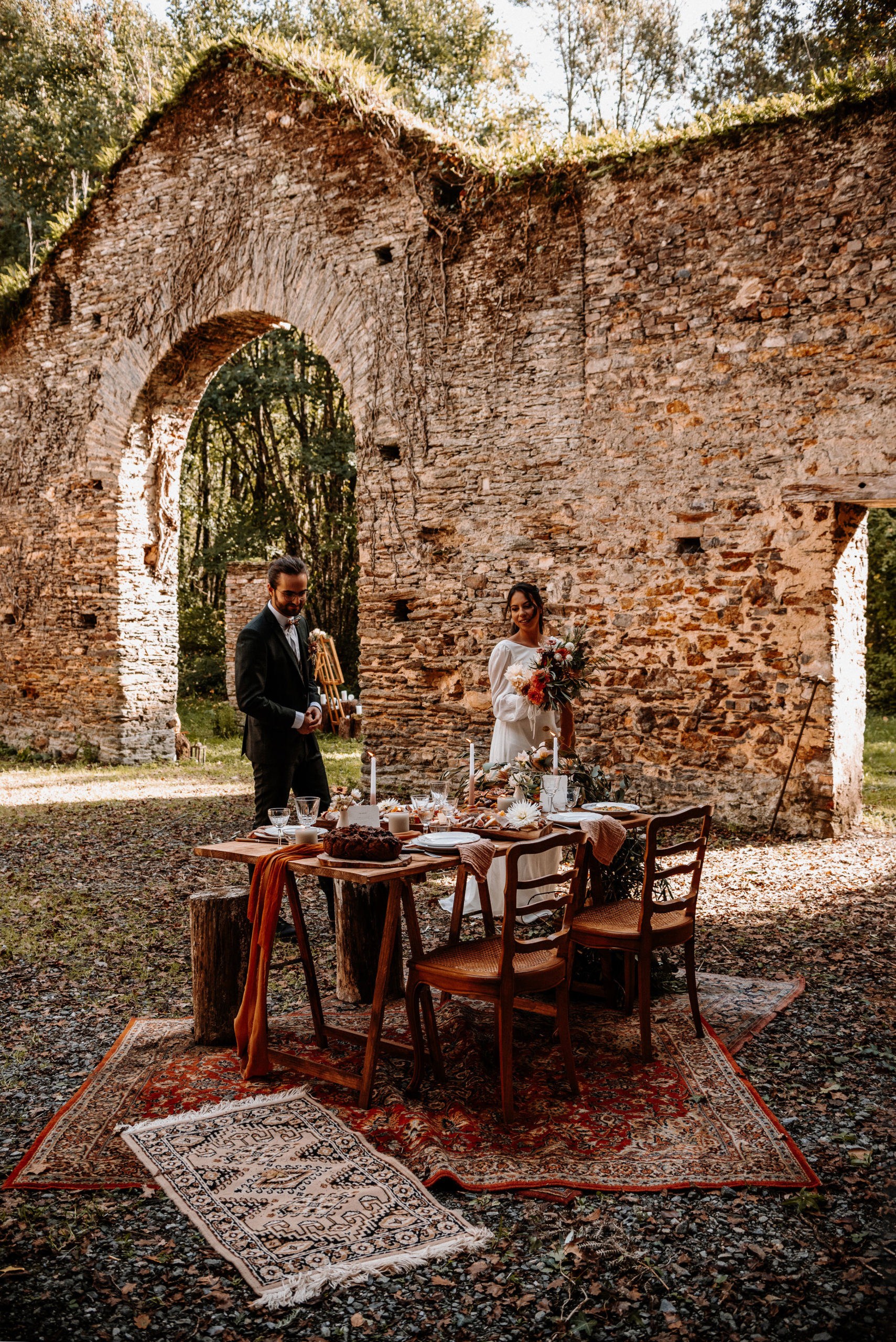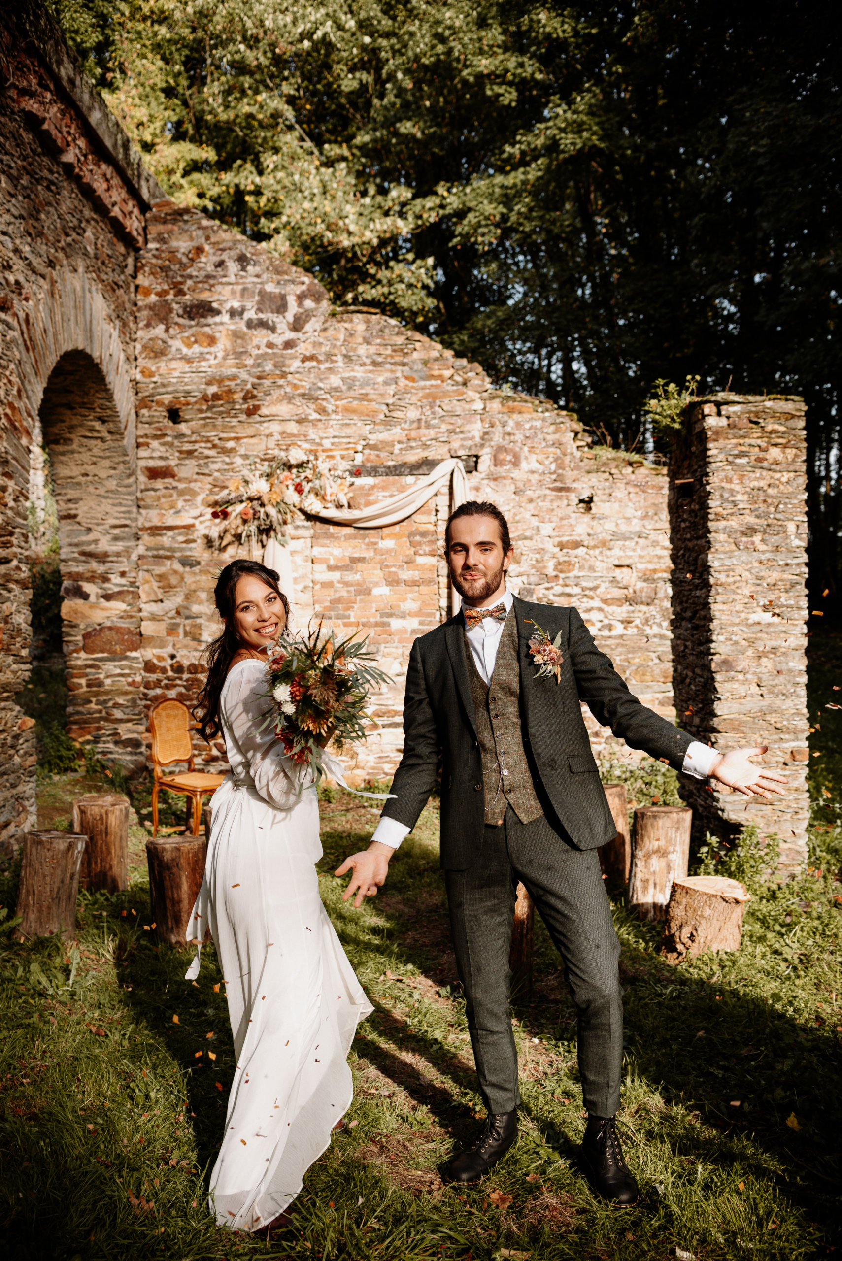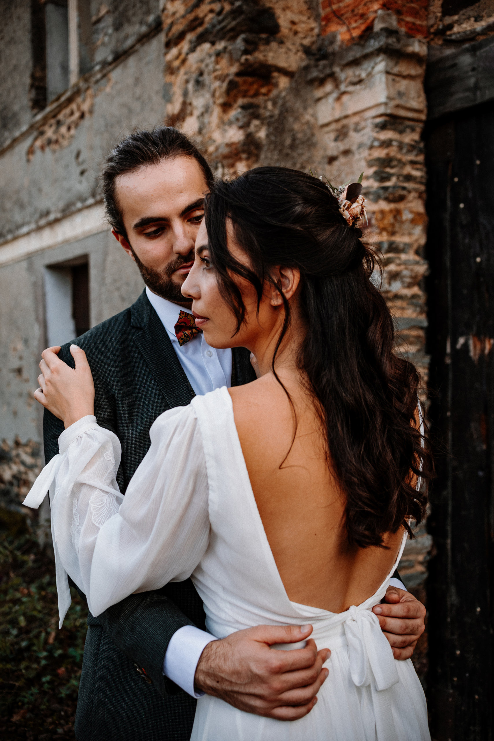 La séance photo s’est déroulée dans les ruines d’un ancien bâtiment en pierre, envahi par le lierre et baigné de lumière douce. Ce décor brut et chargé d’histoire contraste magnifiquement avec la délicatesse des tenues et des fleurs.
