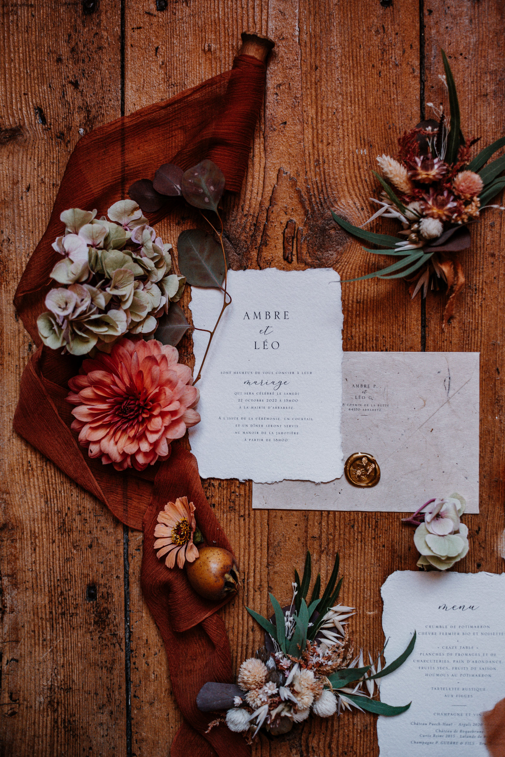 Pour notre shooting d’inspiration, nous avons imaginé une table de mariage automnale aux teintes chaudes : ocre, terracotta, crème, bois brut…