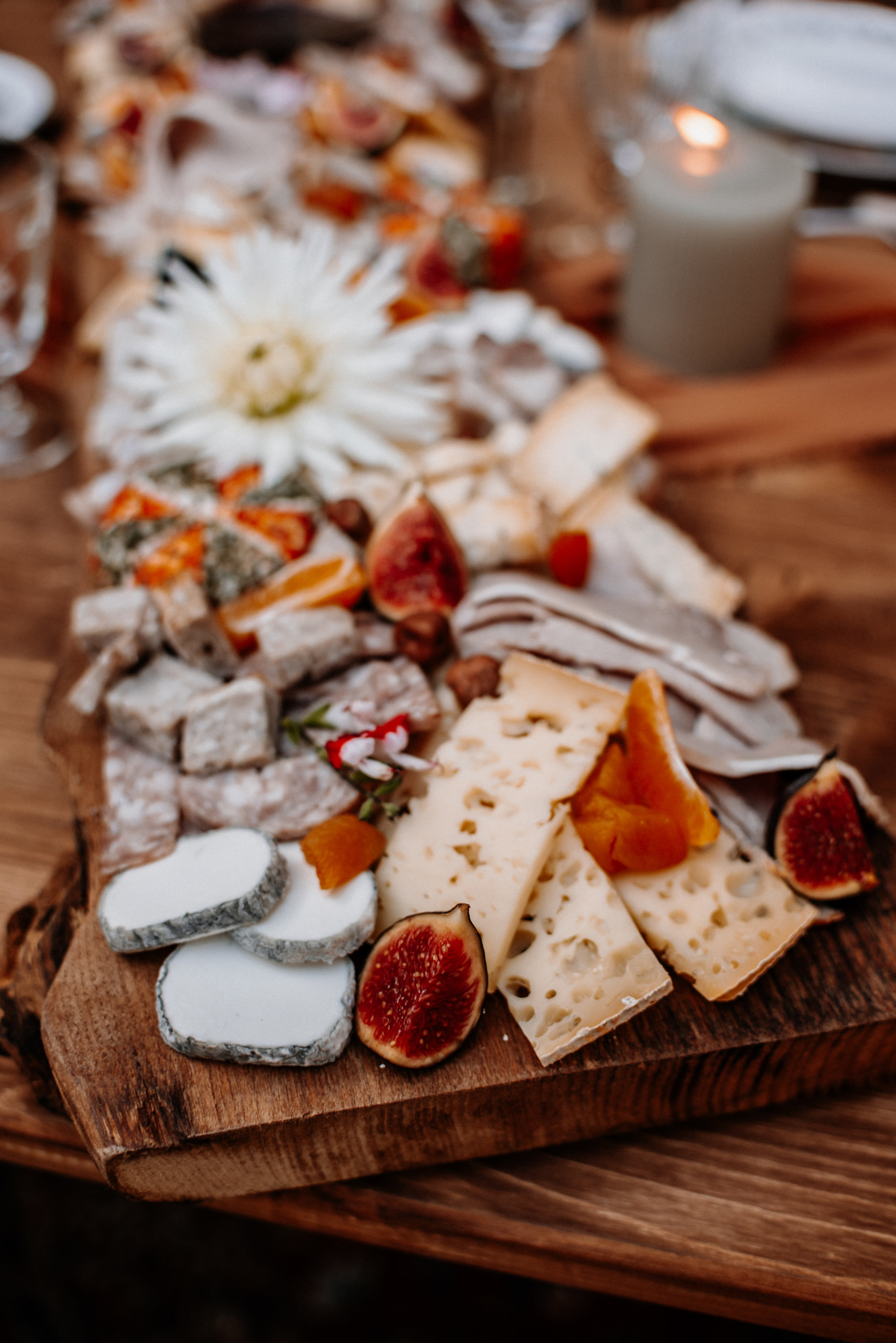 Ici, la vaisselle ancienne se mêle aux verres ciselés, les bougies hautes diffusent une lumière tamisée, et les compositions florales évoquent un jardin rustique. Sur le centre de table, un plateau généreux de fruits de saison, fromages affinés, pains torsadés et figues coupées évoque un banquet d’automne convivial et raffiné.